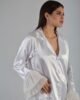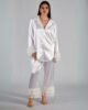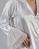 La Pijama Santorini es la combinación perfecta de romanticismo y glamour, confeccionada en suave satín con delicadas aplicaciones de holanes en mangas y bajos del pantalón. Su camisa larga con botones frontales permite llevarla sola o en conjunto, brindando comodidad y estilo. Personalízala con tu nombre o iniciales bordadas y haz de cada noche una experiencia única.