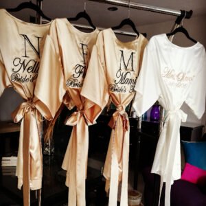Esta bata es perfecta para la noche de bodas, combinando sensualidad y elegancia de manera sutil. Con transparencias delicadas desde la cintura, realza la silueta de manera sofisticada, mientras que sus amplias mangas estilo ángel añaden un toque etéreo y romántico. El satín suave y ligero completa esta prenda, creando una experiencia íntima y especial sin perder el refinado encanto.